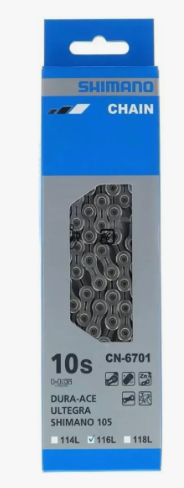 Marca: Shimano; Modelo: CN-6701; Linha: DURA-ACE, ULTEGRA, 105; Compatível: 10 Velocidades; Sistemas: 2x10V e 3X10V; Sistema: HG - HyperGlide; Material: Placa Externa – Zinco, Demais - Aço; Elos: Vazados; Emenda Com Pino De Conexão - INCLUSO; Medida: 116L ELOS Garantia do vendedor: 3 meses