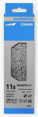 A corrente HG701-11 é direcional e recebe o tratamento SIL-TEC na placa de união do rolete e placa de união por pino, para aumentar a durabilidade. É compatível com as bicicletas de estrada de 11 velocidades, MTB e E-BIKEs em virtude de seu design reforçado. Modelo: CN-HG701-11. Marca: Shimano. Quantidade de elos: 116. Tecnologias: SIL-TEC E HG-X11. Peso: 300gramas. Recomendada para bikes MTB, SPEED E E-BIKES de 11 velocidades linha ULTEGRA OU DEORE XT.